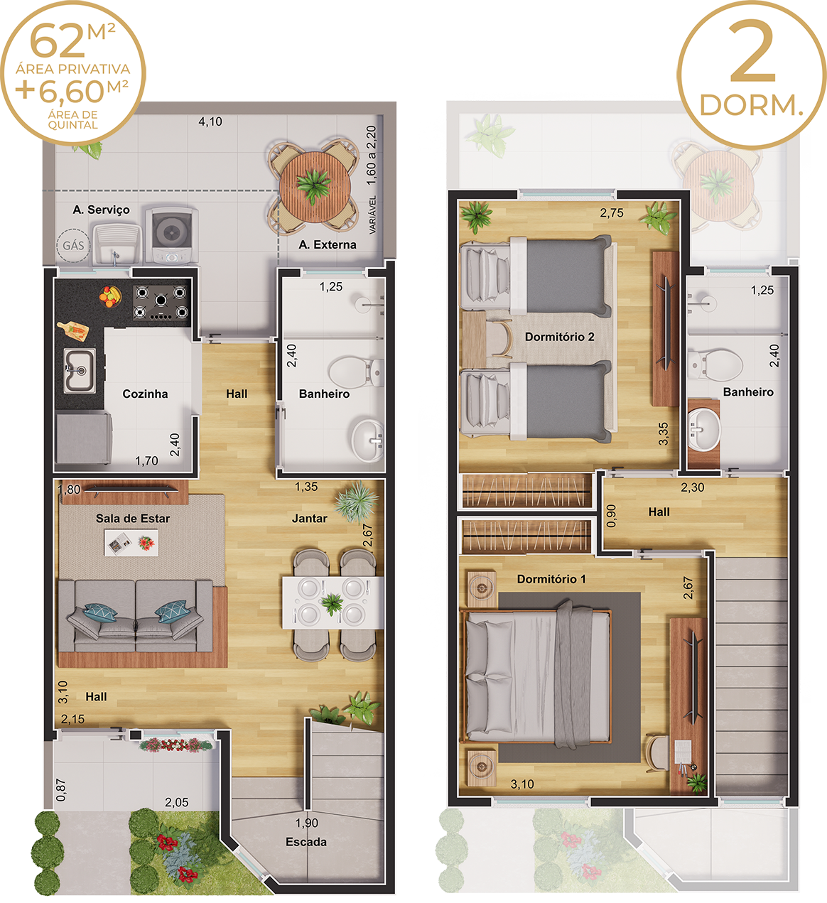 COM 62M² DE ÁREA PRIVATIVA + 6,60M² DE ÁREA DE QUINTAL
